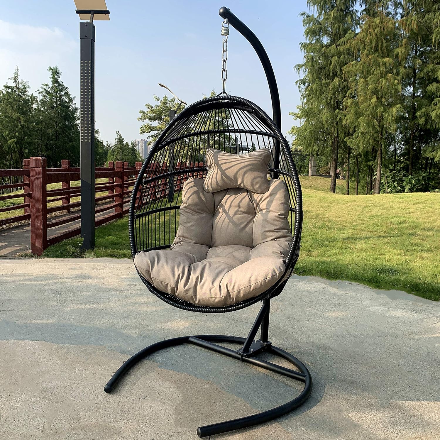 A hanging patio egg chair is suspended from a stand with a wide base. A statement piece for any backyard setting. For best results, always store or cover furniture when not in use.